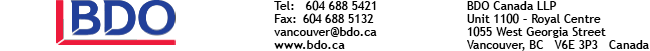 We have complied with the relevant rules of professional conduct / code of ethics applicable to the practice of public accounting and related to assurance engagements, issued by various professional accounting bodies, which are founded on fundamental principles of integrity, objectivity, professional competence and due care, confidentiality and professional behaviour. BDO Canada LLP, a Canadian limited liability partnership, is a member of BDO International Limited, a UK company limited by guarantee, and forms part of the international BDO network of independent member firms.